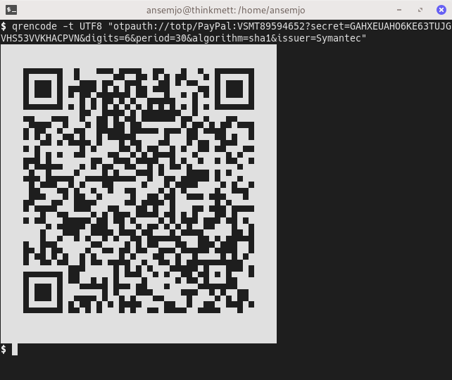 $ qrencode -t UTF8 'otpauth://totp/PayPal:VSMT89594652?secret=GAHXEUAHO6KE63TUJGVHS53VVKHACPVN&digits=6&period=30&algorithm=sha1&issuer=Symantec'