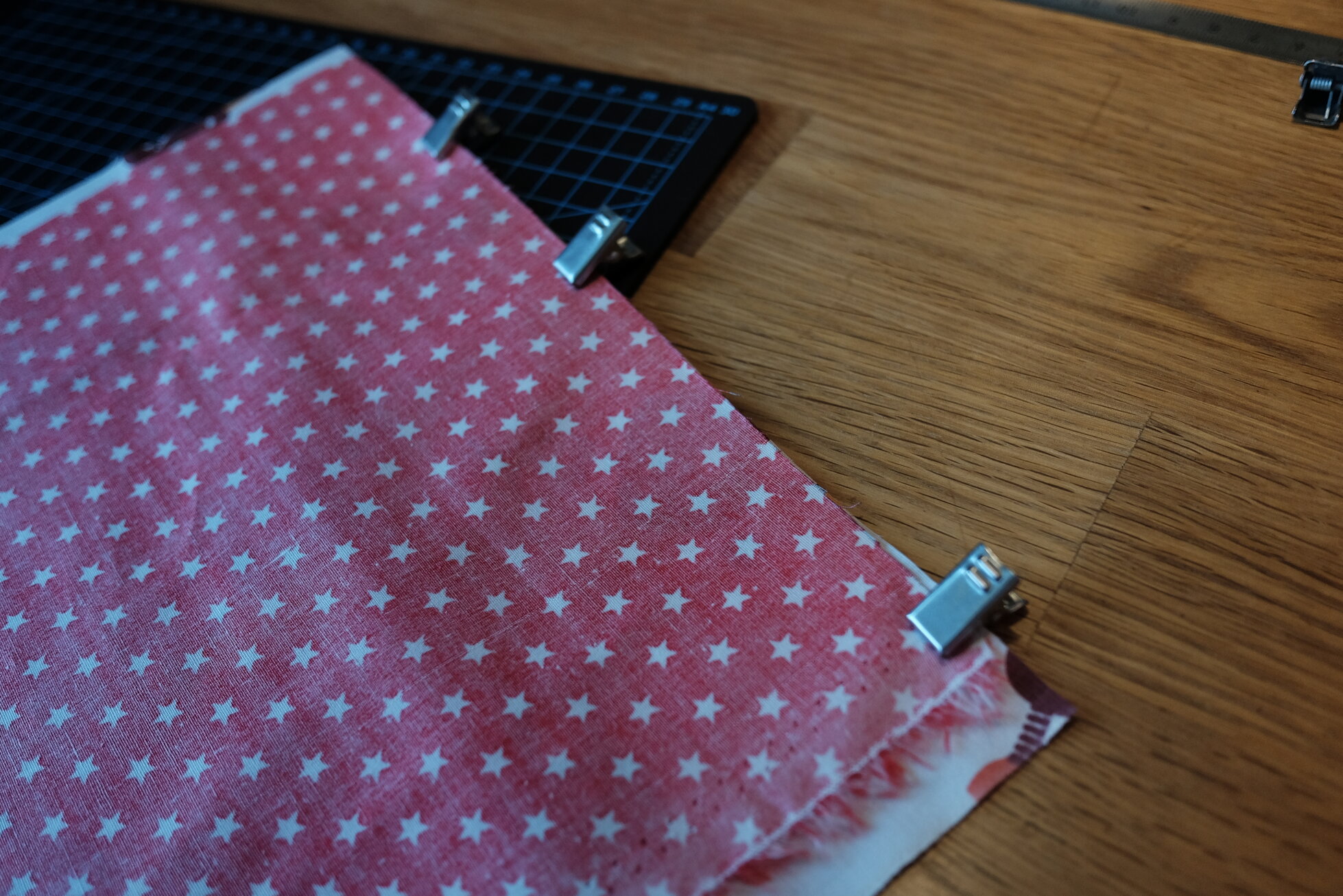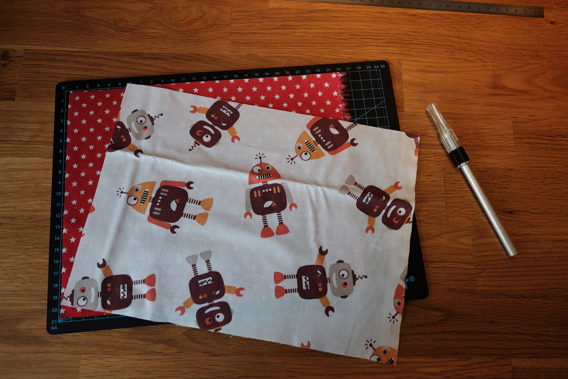 Zunächst braucht ihr zwei rechteckige Stoffzuschnitte von etwa 20 x 25 cm. Also jeweils etwas kürzer als eine A4 Seite.