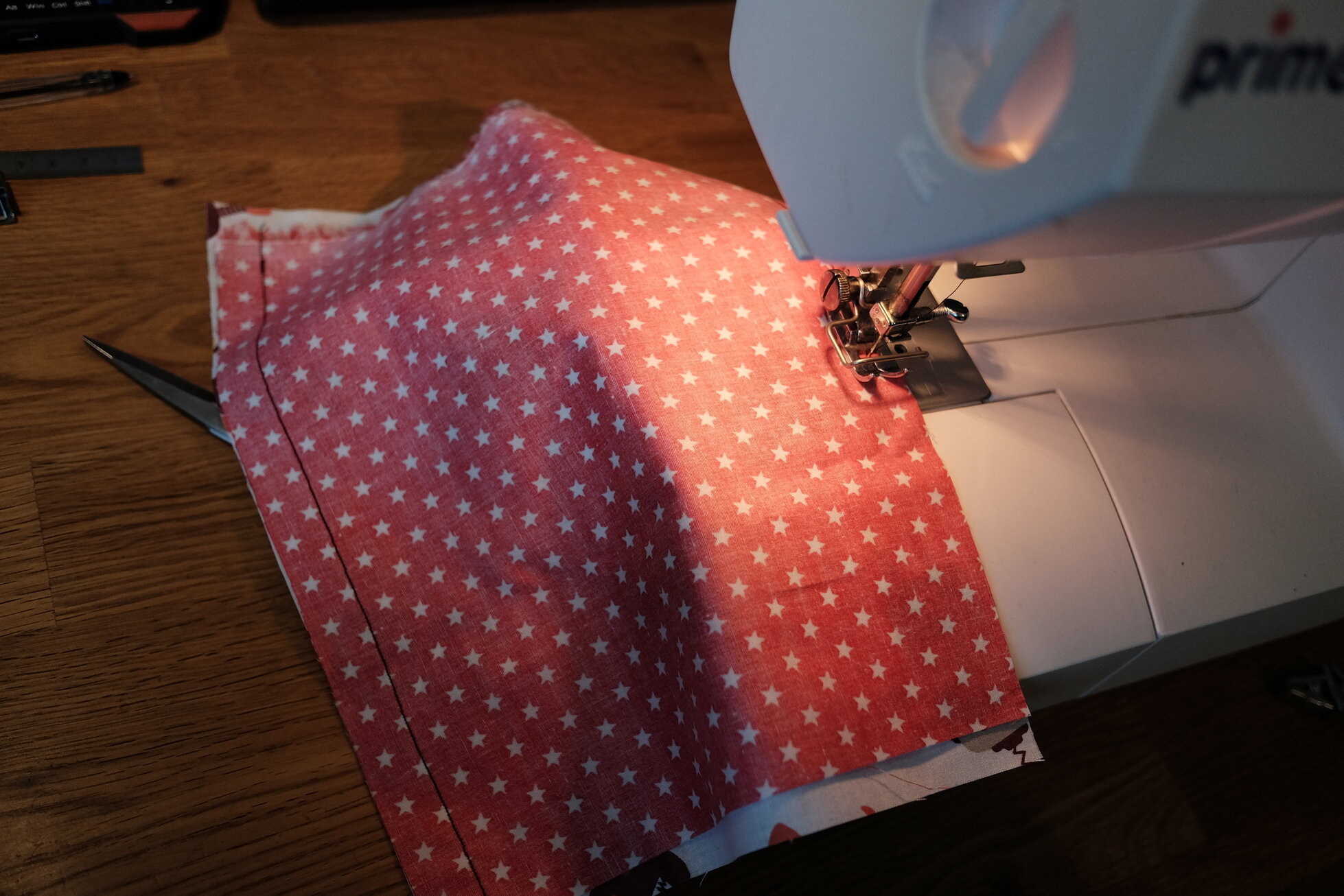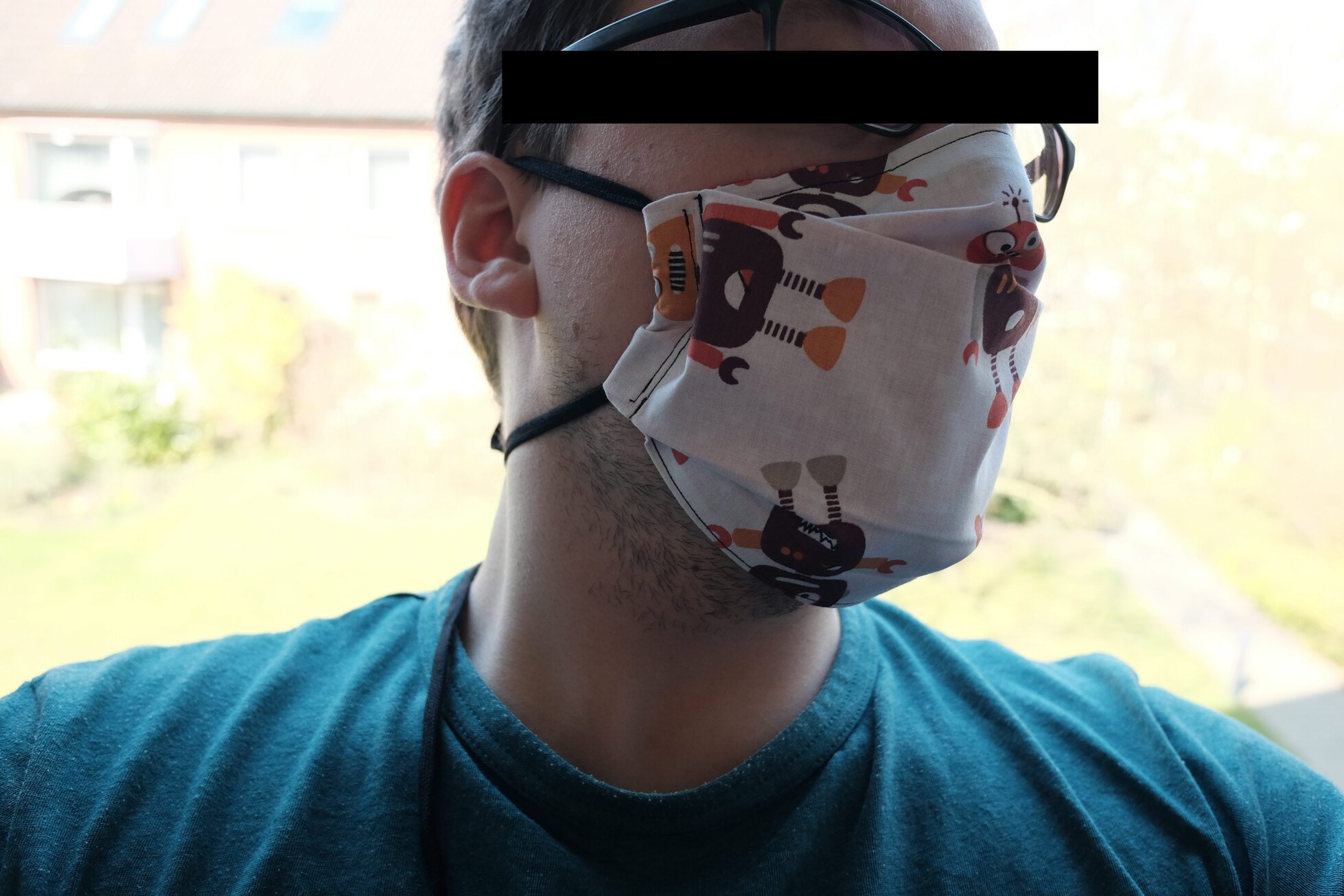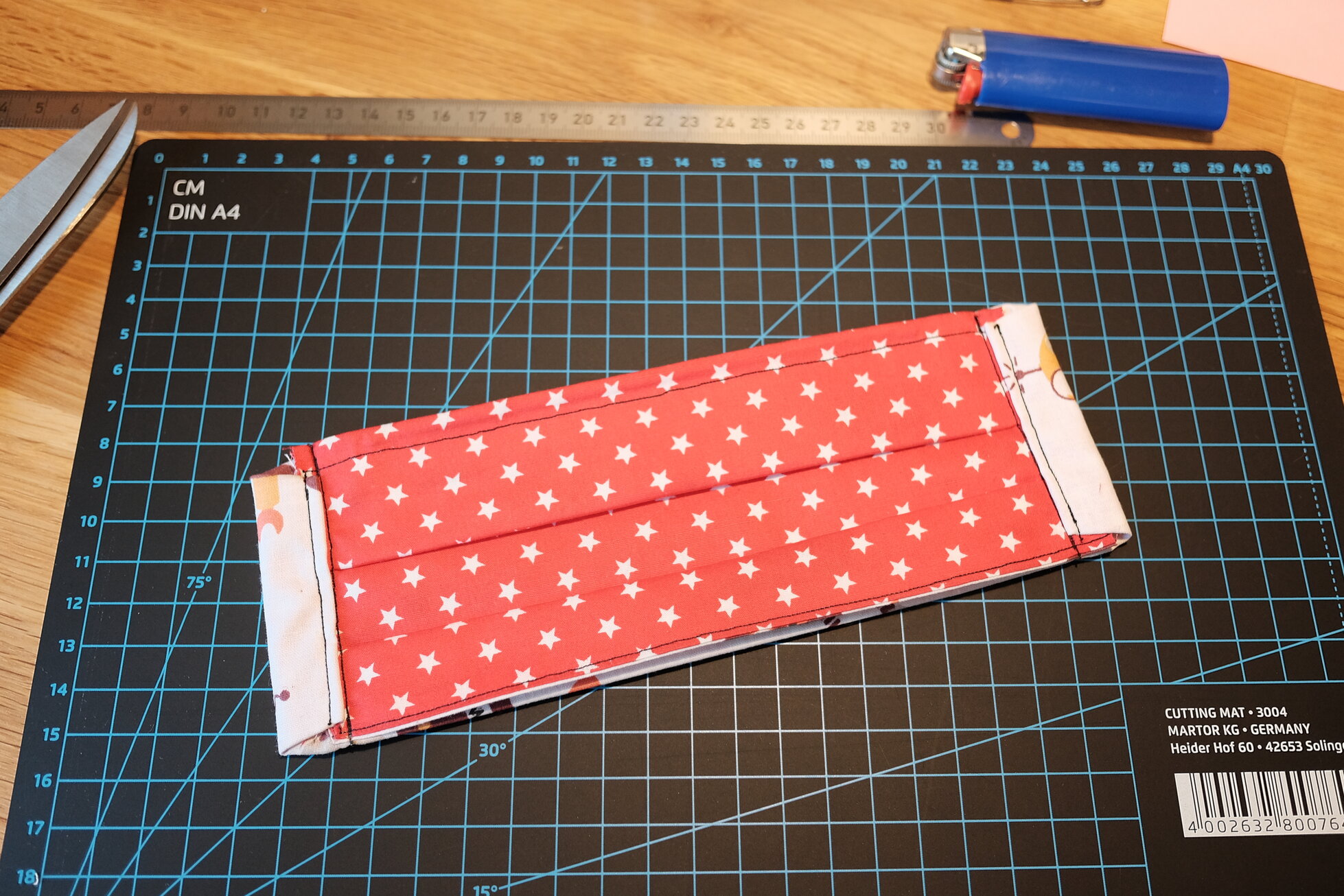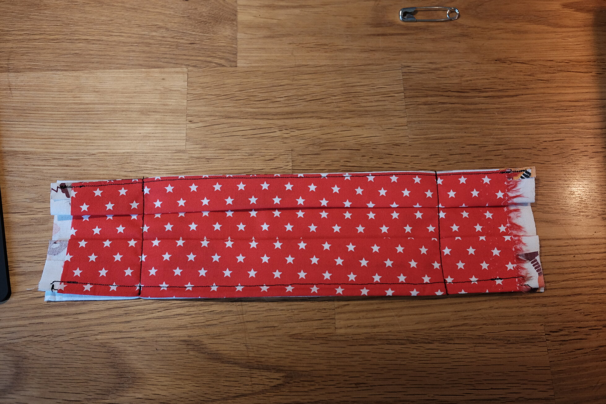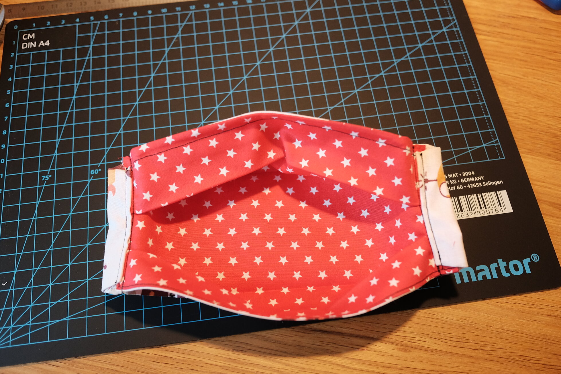Heute morgen stieß ich dann auf ein Bild, in dem die Maske eine etwas andere Form hat und ich beschloss nochmal einen etwas anderen Schnitt auszuprobieren. Dabei erreiche ich durch Umstülpen saubere Kanten ohne diese extra umsäumen zu müssen, kann trotzdem einen Draht für die Passform einlegen und habe durch die seitlichen Schlaufen freie Wahl, wie ich die Maske befestige. Vor allem aber brauche ich dazu nur zwei rechteckige Zuschnitte! Dies ist das Ergebnis.