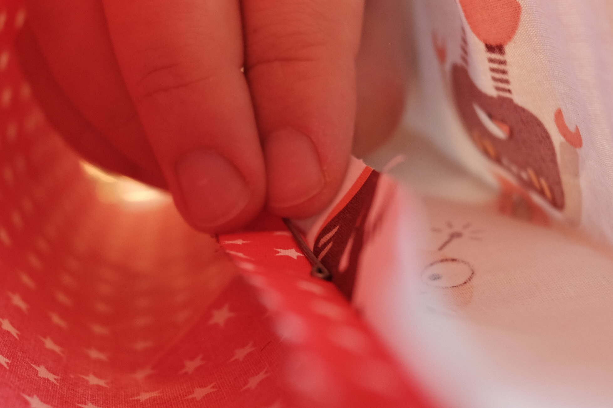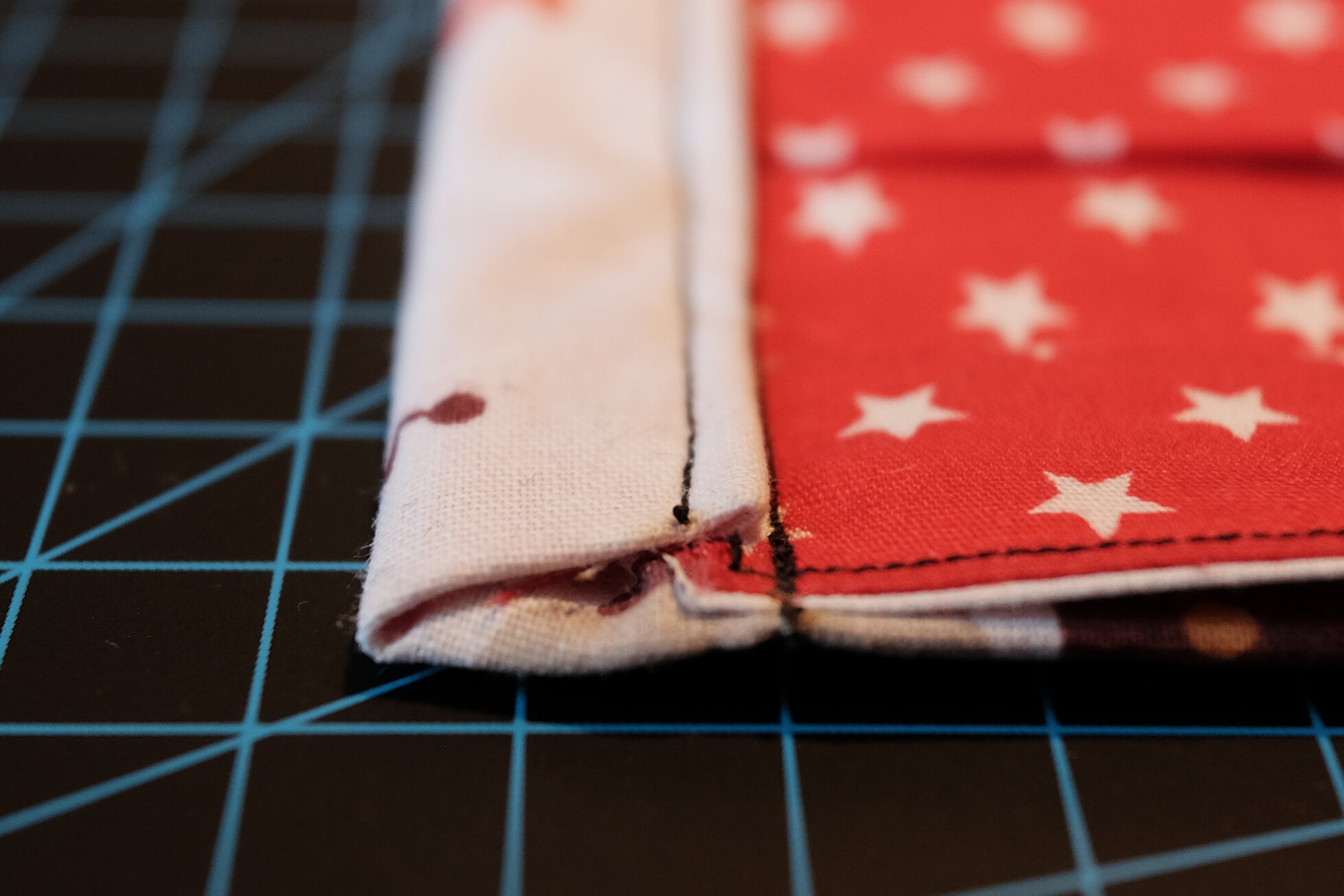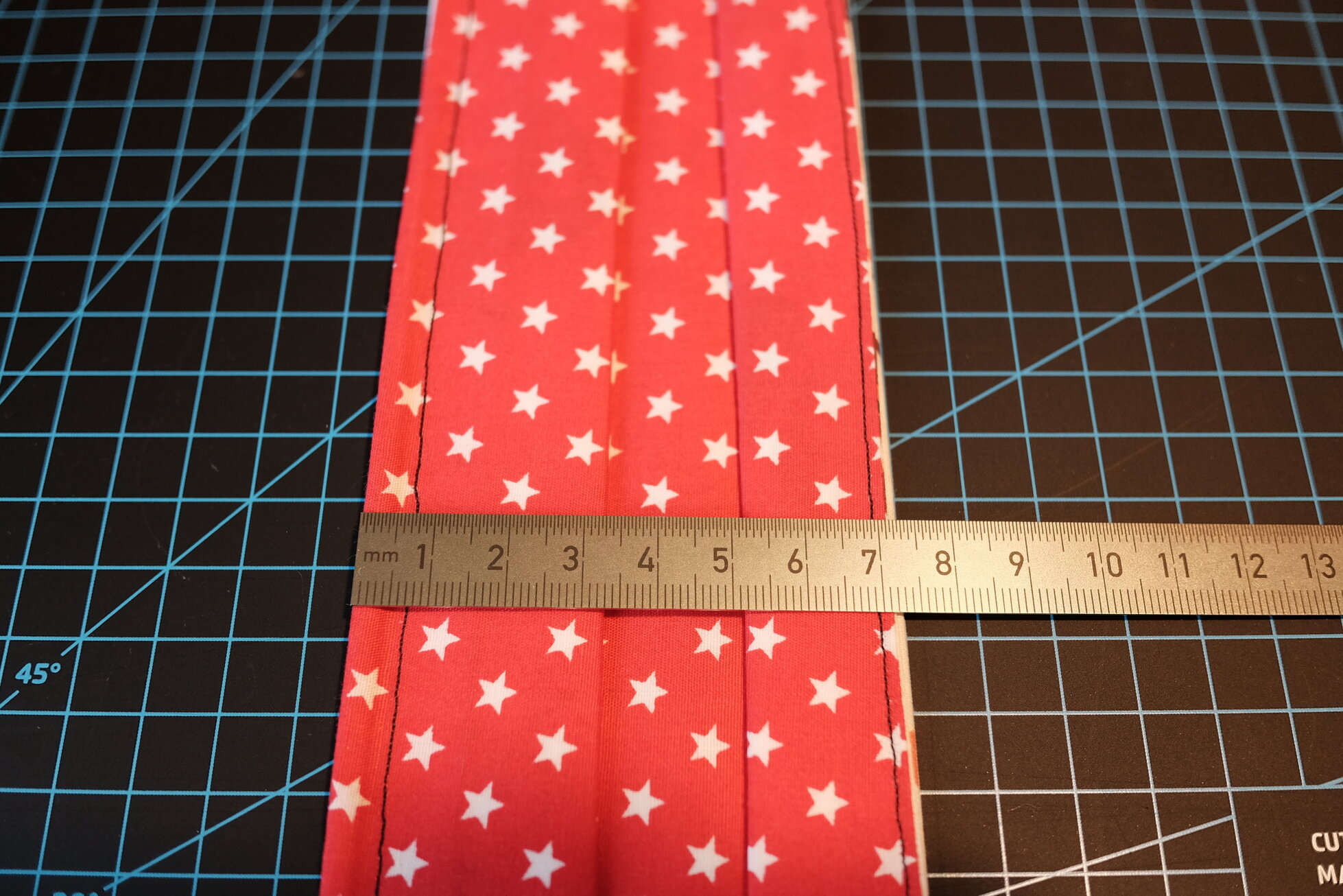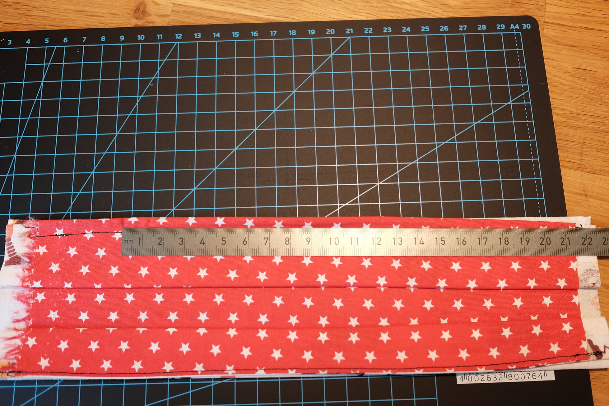 In diesem Schritt wird die gefaltete Maske nun an den Seiten zugenäht. Wichtig ist dabei, dass zwischen den Nähten ungefähr 17 cm liegen. Je nach Kopfumfang könnt ihr das natürlich etwas variieren.