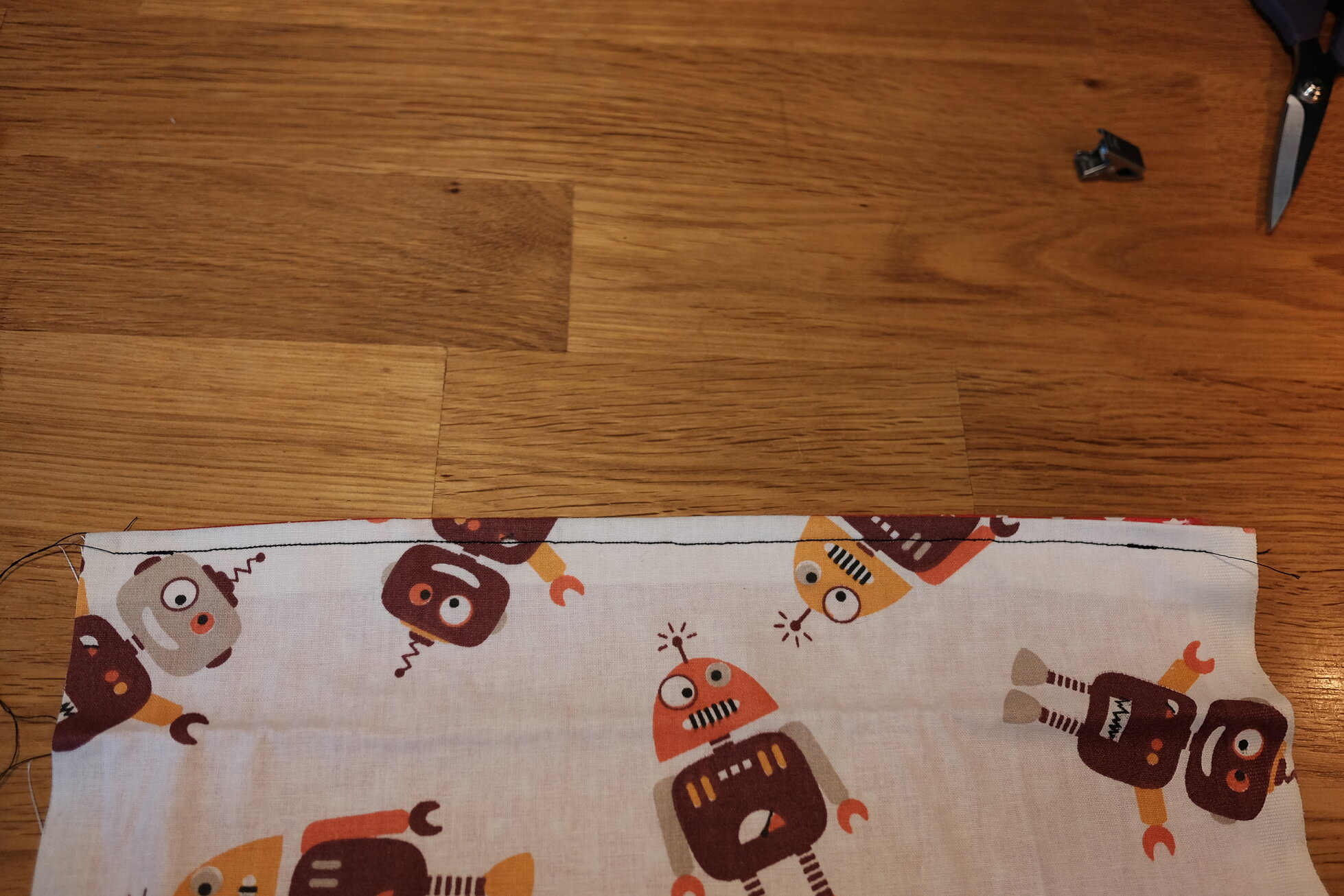 Vor dem nächsten Schritt habe ich in den gefalteten Ecken ein wenig Material weggeschnitten, um es meiner Nähmaschine etwas leichter zu machen. Die seitlichen Enden werden auf 4 cm eingekürzt und dann eingefaltet um eine Art Schlaufe entstehen zu lassen und dabei eine saubere Kante zu erzeugen. Diese steppt ihr dann so nah ihr könnt ab.