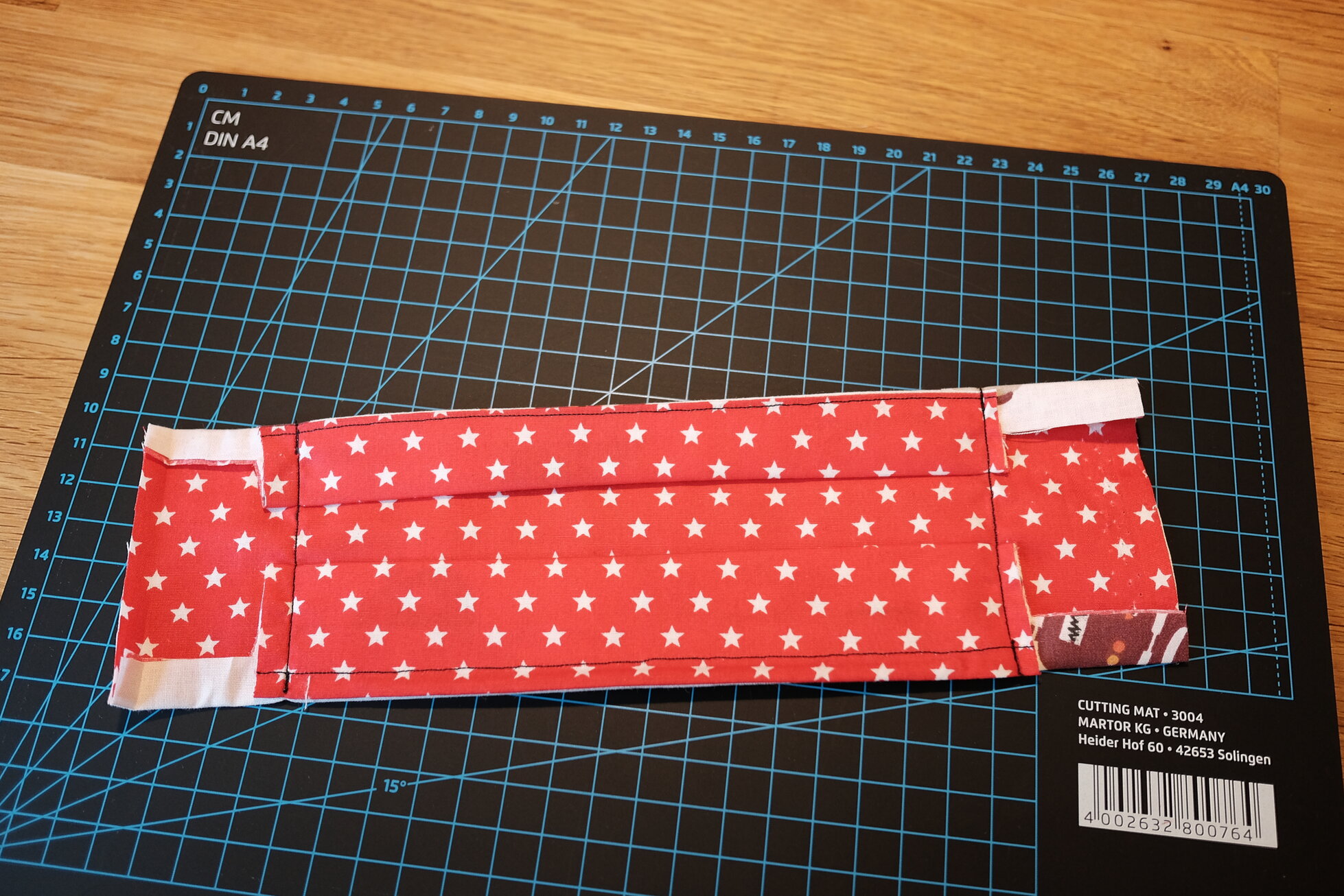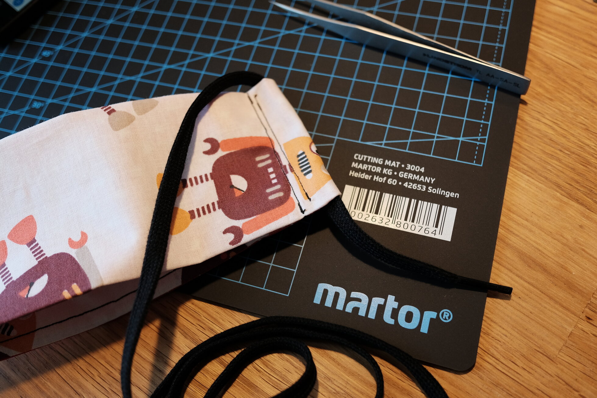 Die ersten Masken habe ich auch nach dieser Anleitung hergestellt. Jedoch fand ich als Amateur an der Nähmaschine einige Stellen relativ knifflig. So fiel mir zum Beispiel das Zuschneiden der dünnen Streifen und das Umsäumen der Ränder nicht besonders leicht. Und auch nach einigen Versuchen mit Gummibändern in verschiedenen Variationen wollte mir das Ergebnis nicht so recht gefallen.