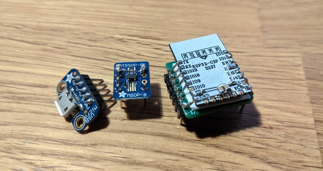 The ESP32-C3 module is glued to the board upside-down and connected to the headers with short pieces of wire. The regulator is a SOT-23-5 part and doesn’t really fit onto the TSSOP-8 footprint either .. but it works out. Some capacitors and pull-ups are added for good measure.